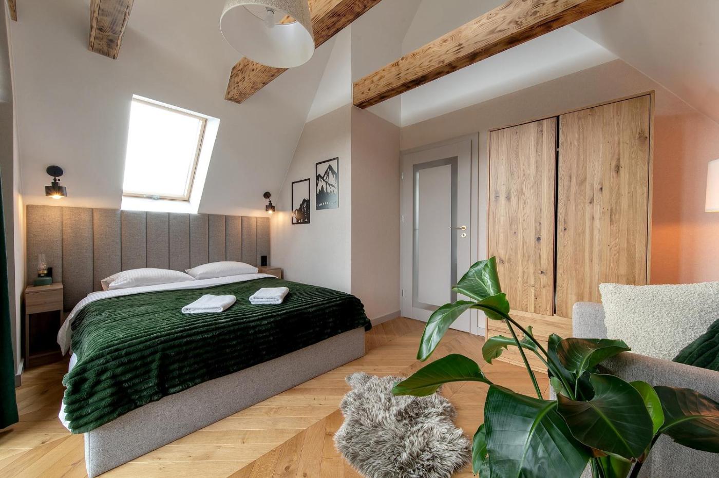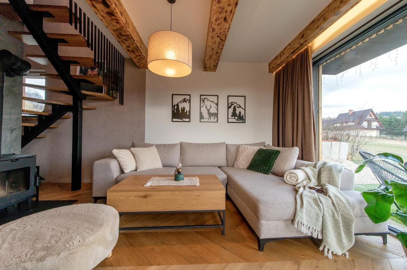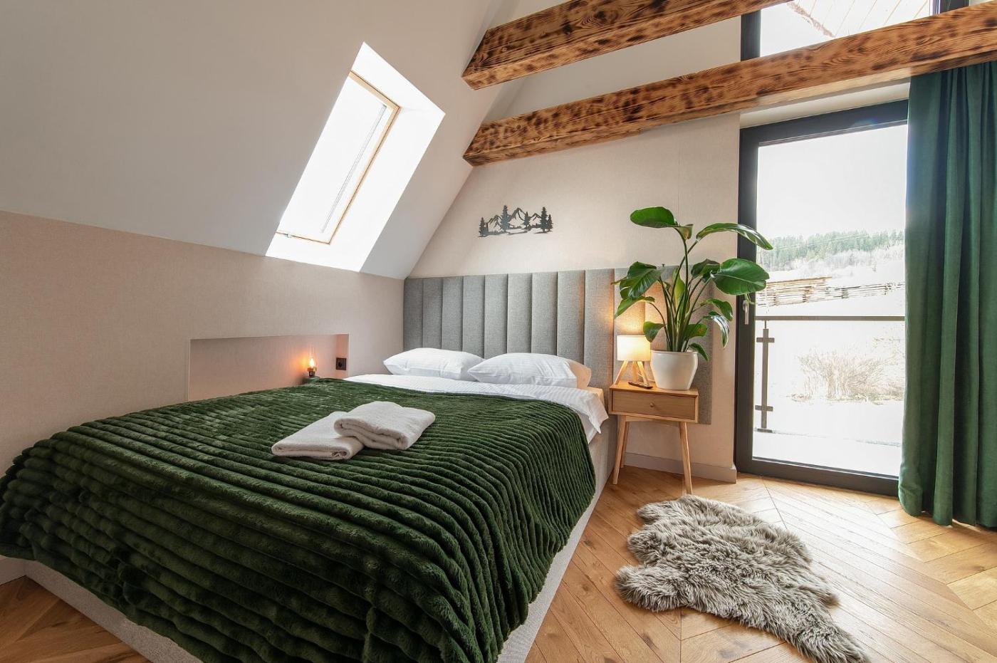 Domek z 2 sypialniami. The hot tub and fireplace are the standout features of this chalet. In the fully equipped kitchen, guests will find a stovetop, a refrigerator, a dishwasher and kitchenware. The spacious air-conditioned chalet provides a flat-screen TV with streaming services, a washing machine, a private entrance, a tea and coffee maker as well as garden views. The unit offers 5 beds. Domek - 9 osobowy. Powierzchnia pokoju ok.: 88 mkw.