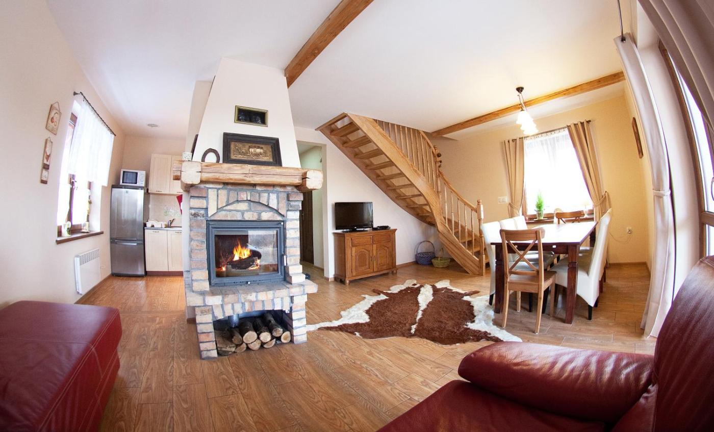 Domek z 3 sypialniami. This chalets special feature is the fireplace. This spacious chalet consists of 1 living room, 3 separate bedrooms and 1 bathroom with a shower and a hairdryer. Guests will find a stovetop, a refrigerator, a dishwasher and kitchenware in the fully equipped kitchen. The chalet also offers a barbecue. Featuring a terrace with garden views, this chalet also provides a washing machine and a flat-screen TV with satellite channels. The unit offers 7 beds. Domek - 8 osobowy. Powierzchnia pokoju ok.: 100 mkw. ;