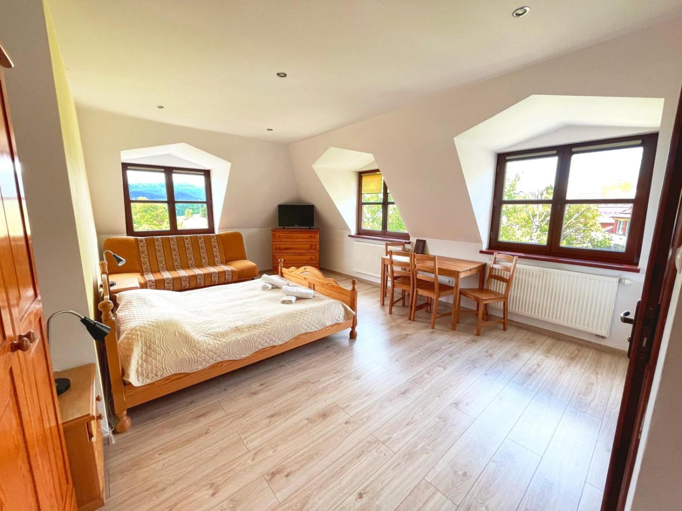 Duże studio. Guests will have a special experience as the studio offers a pool with a view. Guests will find a stovetop, a refrigerator, kitchenware and an electric kettle in the kitchen. The studio also offers a barbecue. The studio provides soundproof walls, a dining area, as well as a private bathroom featuring a shower and a hairdryer. Studio - 5 osobowy. Powierzchnia pokoju ok.: 33 mkw. ;